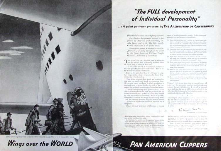 12月のそれもクリスマス直前の広告のためか、企業広告としては、今考えるとちょっと宗教的すぎやしないかと思うほどキリスト教寄りで、内容もカンタベリー大主教のメッセージが中心となっています。パンナムが企業の視点としての「世界大戦が終わってからの理想の世界」を大主教の視点と絡めて語っています。結論的に、話の中心は「中産階級のすべての人が、飛行機での旅行を気軽に楽しむことが出来る時代がやってくるだろう」ということになっていて、先見性のあるメッセージです。