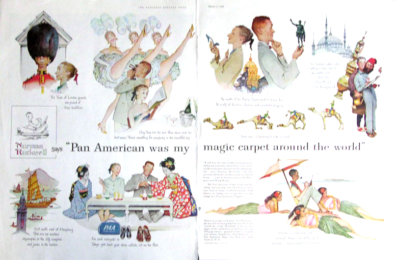 この広告は今は亡きノーマン・ロックウェルがパンアメリカン航空のダブル・デッキ・クリッパーで世界一周をしたとの設定で構成されています。(広告表現について、比較的おおらかだったこの時代、実際にロックウェルが乗ったかどうかはわかりませんが....)当時、ノーマン・ロックウェルは、サタデー・エブニング・ポスト誌で超売れっ子のイラストレーターでしたから、この広告のインパクトは大きかったものと予想されます。他の雑誌や新聞にも掲載されたかどうかはわかりません。