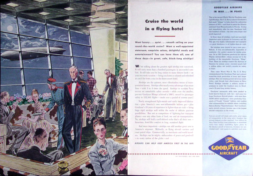 後ろに見えるのは有名なグッドイヤーの飛行船です。そして手前のホテルのロビーのような光景がなんと飛行船の中の様子です!この時期はグッドイヤーも本気でこの飛行船を戦後の豪華旅客輸送手段として考えていたようです。客船のようにゴージャスでありながら3倍から4倍の速さで進める、飛行機よりもずっと軽くて安全な乗り物であるとうたっています。いわば空飛ぶ社交界といったところでしょうか。