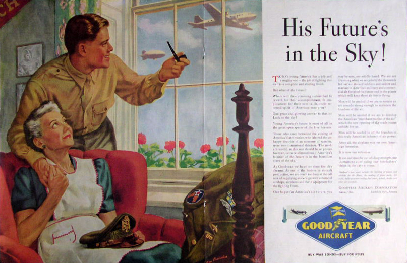 この広告は今からちょうど63年前の1944年9月2日号、サタデー・イブニング・ポスト誌に掲載されました。会社名は正確には「GOODYEAR AIRCRAFT CORPORATION」で、この当時は飛行船やF4Uコルセアなどを生産し、アメリカの軍事航空産業では重要な位置を占めていたようです。
