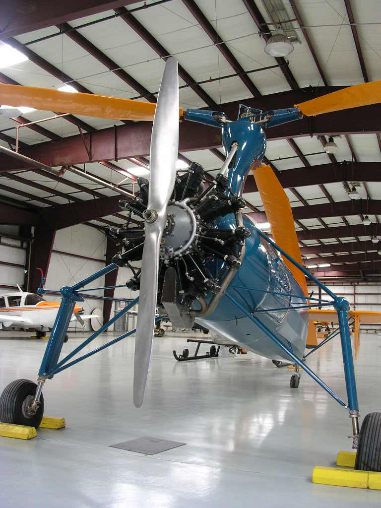 全長33.7フィート、高さ12フィート5インチ、225馬力の二人乗りです。青とオレンジに近い黄色で塗装され、どこか昆虫のような印象です。一見ヘリコプターのようでもありますがブレードを回転させるエンジンはありません。プロペラからの風力でブレードを回す構造になっているらしいです。(詳しくご存知の方はご一報ください)そのため、プロペラが回っている間はブレードを止めることは出来ません。後部にあるコックピットに座ると頭からブレードまでは、おそらく50センチもないのではないでしょうか。「ばんざーい!」なんてうっかりできませんね。