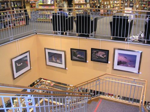 AviationArt.jp(航空絵画ウェブサイト)のスタジオ訪問でもご紹介したウィリアム・アランセの作品の展示が、南カリフォルニア、サウスコースト・プラザ(South Coast Plaza)という巨大モールの中にあるボーダーズ(BORDERS)という本屋さんで8月1日より始まりました。期間は1か月、私がコーディネート、およびフレーミング(額装)をしています。彼の展示は今回が2回目。前回は小さな作品ばかりでしたが、ソファの上に飾れるサイズのものが欲しいとの要望が多かったので、額も入れて75センチx50センチくらいのものも作りました。