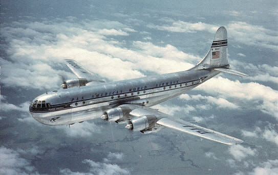 ここで登場するのはボーイングB-377「Strato Clipper」です。これは2階建て、今のジャンボとは逆に上が客室、下がラウンジという構造になっています。私の知る限りではこの飛行機、もともとは爆撃機用の設計で、下は爆弾の格納庫として作られたとのことです。第二次世界大戦も終わり、平和な時代を迎えて、旅客機として生まれ変わりました。それにしても広告に出ているこのおばさん、ベッドに横たわっていますね。現代のファーストクラスでも「180度に近いリクライニング」にしかならないのに、これホントのベッドですよ。食事も運んでもらってまぁ、優雅というかゴージャスというか、でもいったいこんなところでどうやって食うんだ、って思ってしまいます。